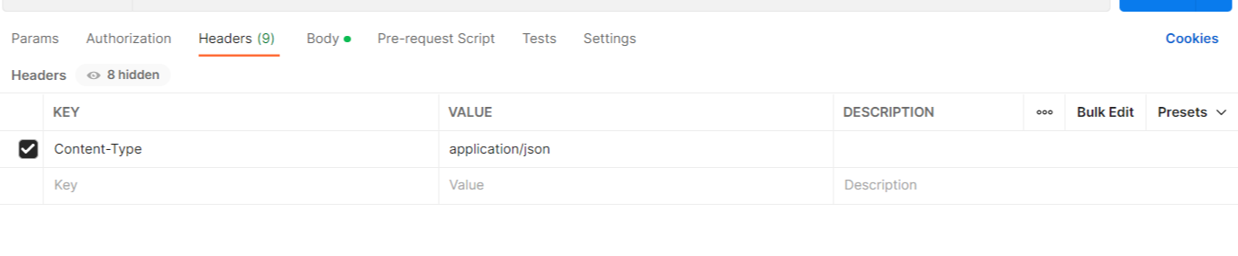 package jpabook.jpashop.api; import jpabook.jpashop.domain.Member; import jpabook.jpashop.service.MemberService; import lombok.Data; import lombok.RequiredArgsConstructor; import org.springframework.web.bind.annotation.PostMapping; import org.springframework.web.bind.annotation.RequestBody; import org.springframework.web.bind.annotation.RestController; import javax.validation.Valid; @RestController @RequiredArgsConstructor public class MemberApiController { private final MemberService memberService; @PostMapping("/api/v1/members") public CreateMemberResponse saveMemberV1(@RequestBody @Valid Member member) { Long id = memberService.join(member); return new CreateMemberResponse(id); } @Data static class CreateMemberResponse { private Long id; public CreateMemberResponse(Long id) { this.id = id; } } }1) 포스트맨 - 헤더 설정
