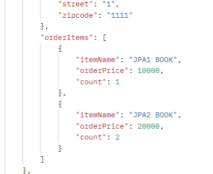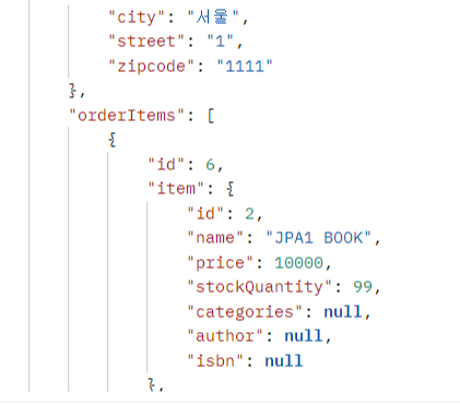 package jpabook.jpashop.api; import jpabook.jpashop.domain.Order; import jpabook.jpashop.domain.OrderItem; import jpabook.jpashop.repository.OrderRepository; import jpabook.jpashop.repository.OrderSearch; import lombok.RequiredArgsConstructor; import org.springframework.web.bind.annotation.GetMapping; import org.springframework.web.bind.annotation.RestController; import java.util.List; @RestController @RequiredArgsConstructor public class OrderApiController { private final OrderRepository orderRepository; @GetMapping("/api/v1/orders") public List<Order> ordersV1() { List<Order> all = orderRepository.findAllByString(new OrderSearch()); for (Order order : all) { order.getMember().getName(); //Lazy 강제 초기화 order.getDelivery().getAddress(); //Lazy 강제 초기환 List<OrderItem> orderItems = order.getOrderItems(); // for (OrderItem orderItem : orderItems) { // orderItem.getItem().getName(); // } orderItems.stream().forEach(o -> o.getItem().getName()); } return all; } }- orderItem , item 관계를 직접 초기화하면 Hibernate5Module 설정에 의해 엔티티를 JSON으로 생성한다