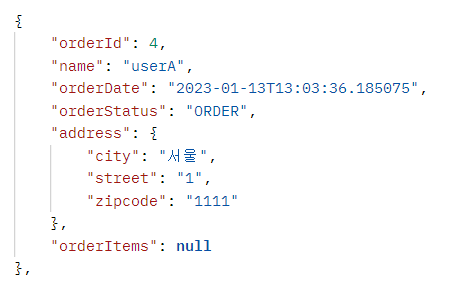 @GetMapping("/api/v2/orders") public List<OrderDto> ordersV2() { List<Order> orders = orderRepository.findAllByString(new OrderSearch()); List<OrderDto> collect = orders.stream() .map(o -> new OrderDto(o)) .collect(Collectors.toList()); return collect; } @Data static class OrderDto { private Long orderId; private String name; private LocalDateTime orderDate; private OrderStatus orderStatus; private Address address; private List<OrderItem> orderItems; public OrderDto(Order order) { orderId = order.getId(); name = order.getMember().getName(); orderDate = order.getOrderDate(); orderStatus = order.getStatus(); address = order.getDelivery().getAddress(); orderItems = order.getOrderItems(); } }