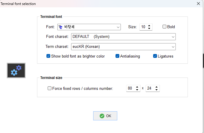 1. mobaxterm > settings > terminal > default terminal font settings > 바탕체 / default / eucKR 로 변경