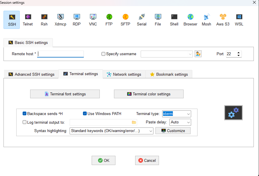 2. 세션을 삭제 후 다시 만들면서 마찬가지로 아래의 terminal settings 1과 같이 변경해 준다