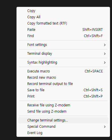 3. 세션이 만들어지면 contrlol + 오른쪽 마우스 > change terminal settings