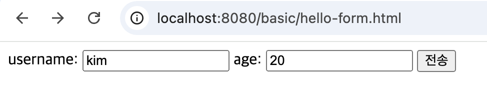 // src/main/webapp/basic/hello-form.html 생성 <!DOCTYPE html> <html> <head> <meta charset="UTF-8"> <title>Title</title> </head> <body> <form action="/request-param" method="post"> username: <input type="text" name="username" /> age: <input type="text" name="age" /> <button type="submit">전송</button> </form> </body> </html>