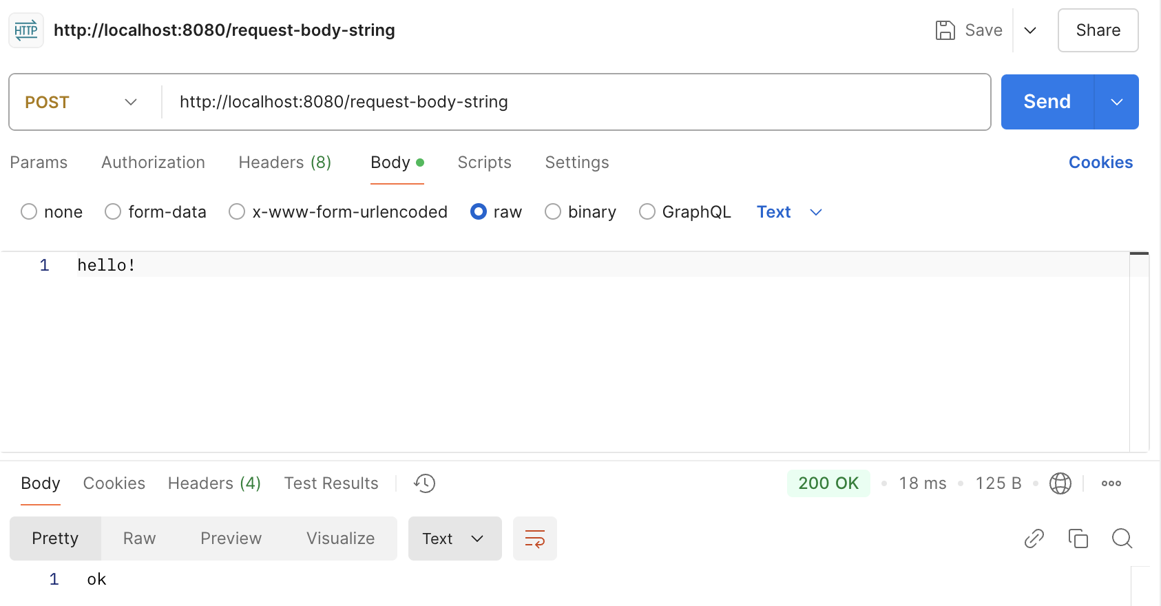 @WebServlet(name = "requestBodyStringServlet", urlPatterns = "/request-body-string") public class RequestBodyStringServlet extends HttpServlet{ @Override protected void service(HttpServletRequest request, HttpServletResponse response) throws ServletException, IOException { ServletInputStream inputStream = request.getInputStream(); String messageBody = StreamUtils.copyToString(inputStream, StandardCharsets.UTF_8); System.out.println("messageBody = " + messageBody); response.getWriter().write("ok"); } }