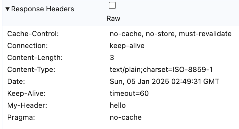 @WebServlet(name = "responseHeaderServlet", urlPatterns = "/response-header") public class ResponseHeaderServlet extends HttpServlet { @Override protected void service(HttpServletRequest request, HttpServletResponse response) throws ServletException, IOException { // [status-line] response.setStatus(HttpServletResponse.SC_OK); // [response-headers] response.setHeader("Content-Type", "text/plain"); response.setHeader("Cache-Control", "no-cache, no-store, must-revalidate"); response.setHeader("Pragma", "no-cache"); response.setHeader("my-header", "hello"); PrintWriter writer = response.getWriter(); writer.println("ok"); } }
