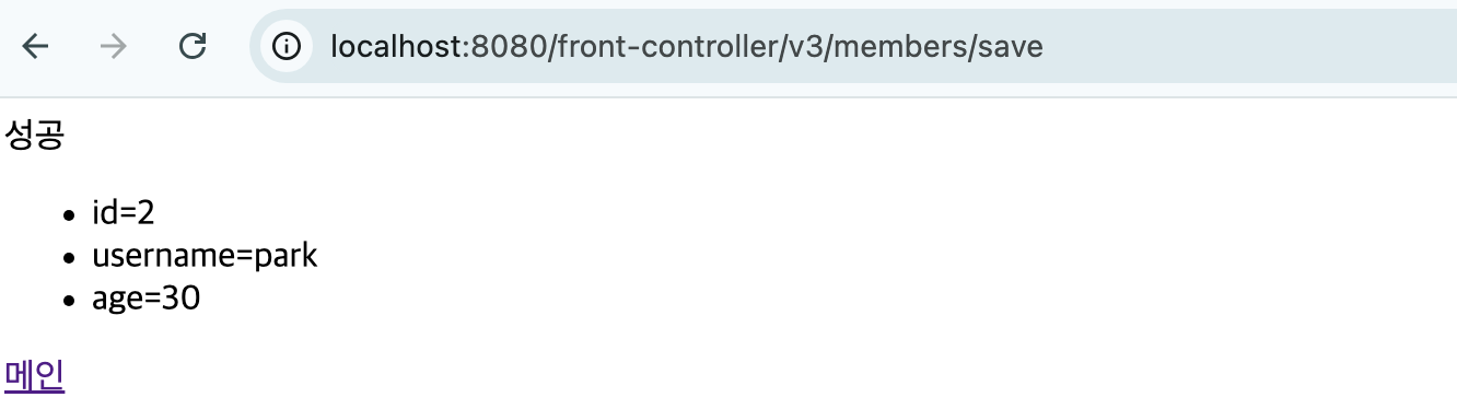 public class MemberSaveControllerV3 implements ControllerV3 { private MemberRepository memberRepository = MemberRepository.getInstance(); @Override public ModelView process(Map<String, String> paramMap) { String username = paramMap.get("username"); int age = Integer.parseInt(paramMap.get("age")); Member member = new Member(username, age); memberRepository.save(member); ModelView mv = new ModelView("save-result"); mv.getModel().put("member", member); return mv; } }5. MemberListControllerV3 - 회원 목록