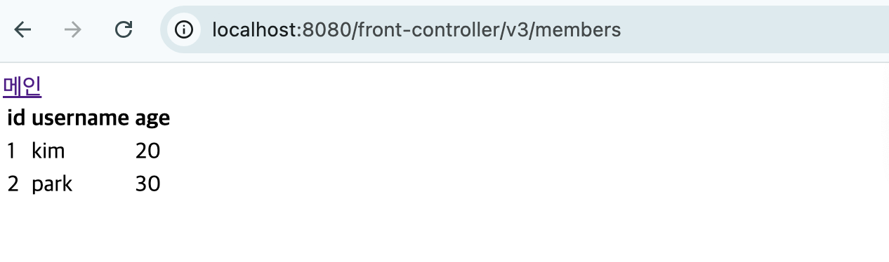 public class MemberListControllerV3 implements ControllerV3 { private MemberRepository memberRepository = MemberRepository.getInstance(); @Override public ModelView process(Map<String, String> paramMap) { List<Member> members = memberRepository.findAll(); ModelView mv = new ModelView("members"); mv.getModel().put("members", members); return mv; } }6. FrontControllerServletV3