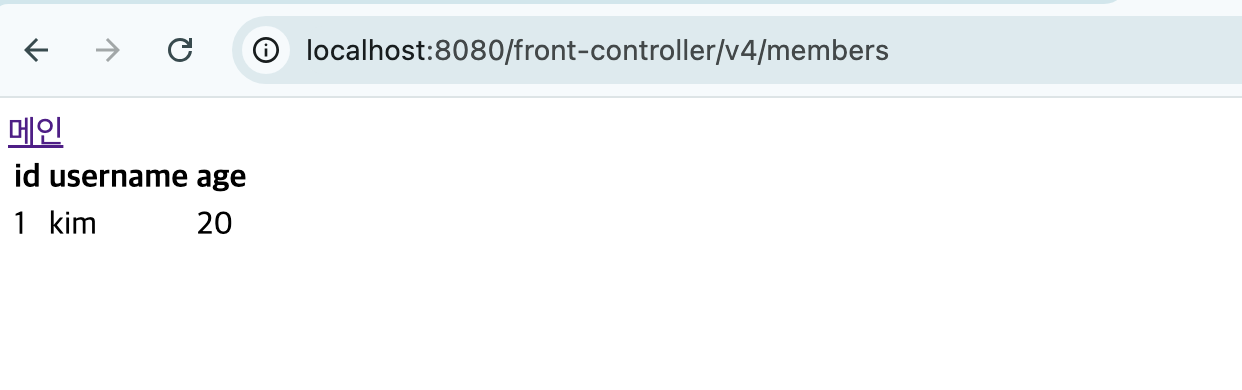 public class MemberListControllerV4 implements ControllerV4 { private MemberRepository memberRepository = MemberRepository.getInstance(); @Override public String process(Map<String, String> paramMap, Map<String, Object> model) { List<Member> members = memberRepository.findAll(); model.put("members", members); return "members"; } }5. FrontControllerServletV4