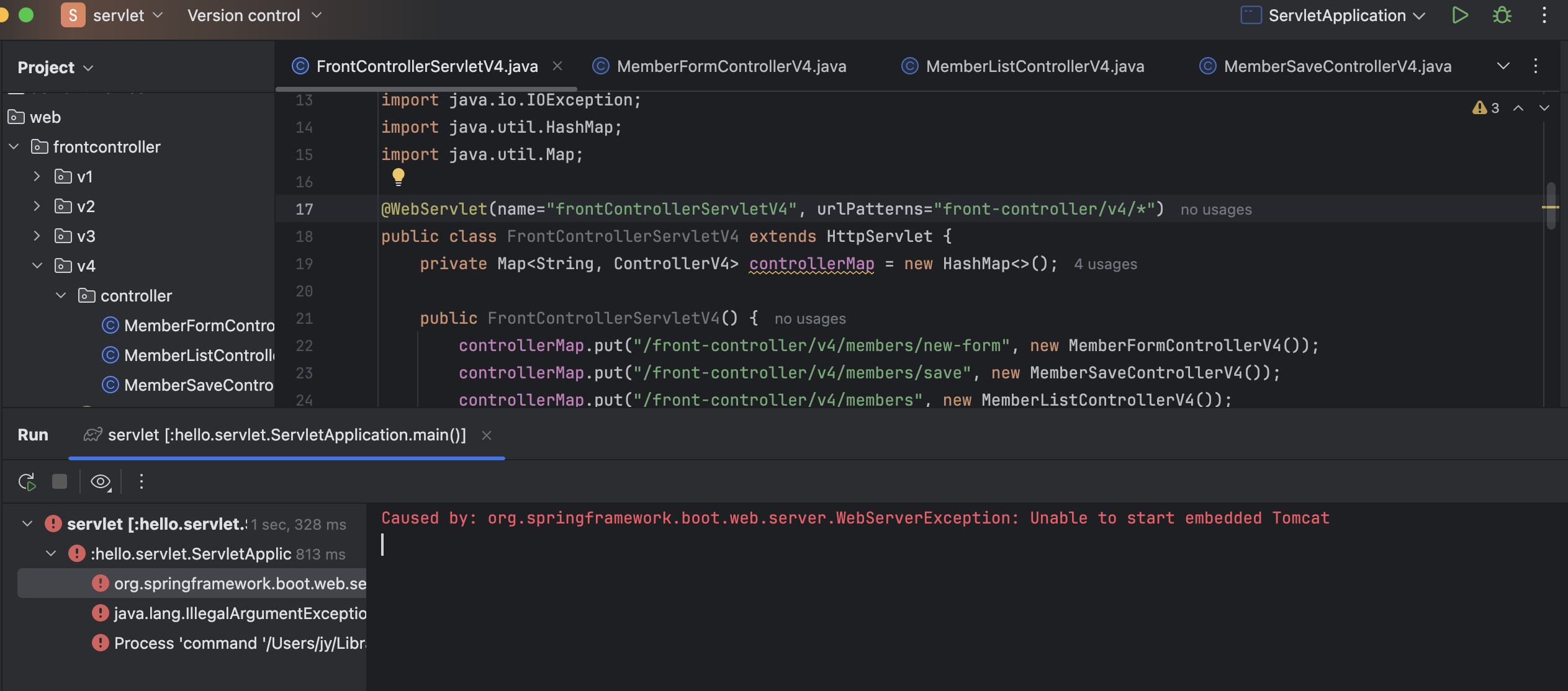 "front-controller/v4/*" > "/front-controller/v4/*" 수정 나의 경우 서블릿 매핑 오류가 원인이었다