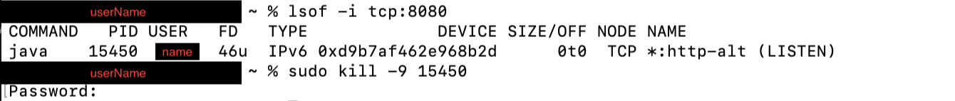 1. lsof -i tcp:8080 명령어를 통해 현재 8080 포트가 사용 중인지 확인