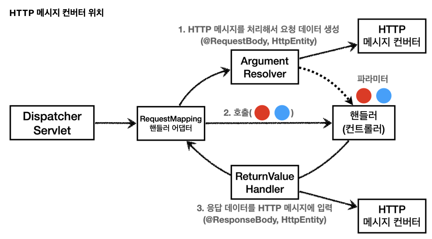 - 응답의 경우 : @ResponseBody와 HttpEntity를 처리하는 ReturnValueHandler가 있다 그리고 여기에서 HTTP 메시지 컨버터를 호출해서 응답 결과를 만든다