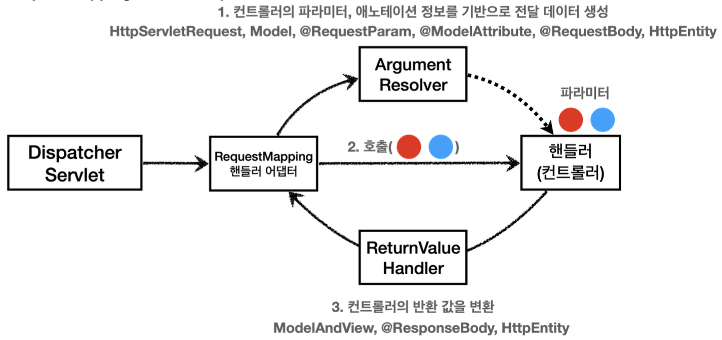 애노테이션 기반 컨트롤러를 처리하는 RequestMappingHandlerAdapter는 바로 이 ArgumentResolver를 호출해서 컨트롤러(핸들러)가 필요로 하는 다양한 파라미터의 값(객체)을 생성한다 그리고 이렇게 파리미터의 값이 모두 준비되면 컨트롤러를 호출하면서 값을 넘겨준다