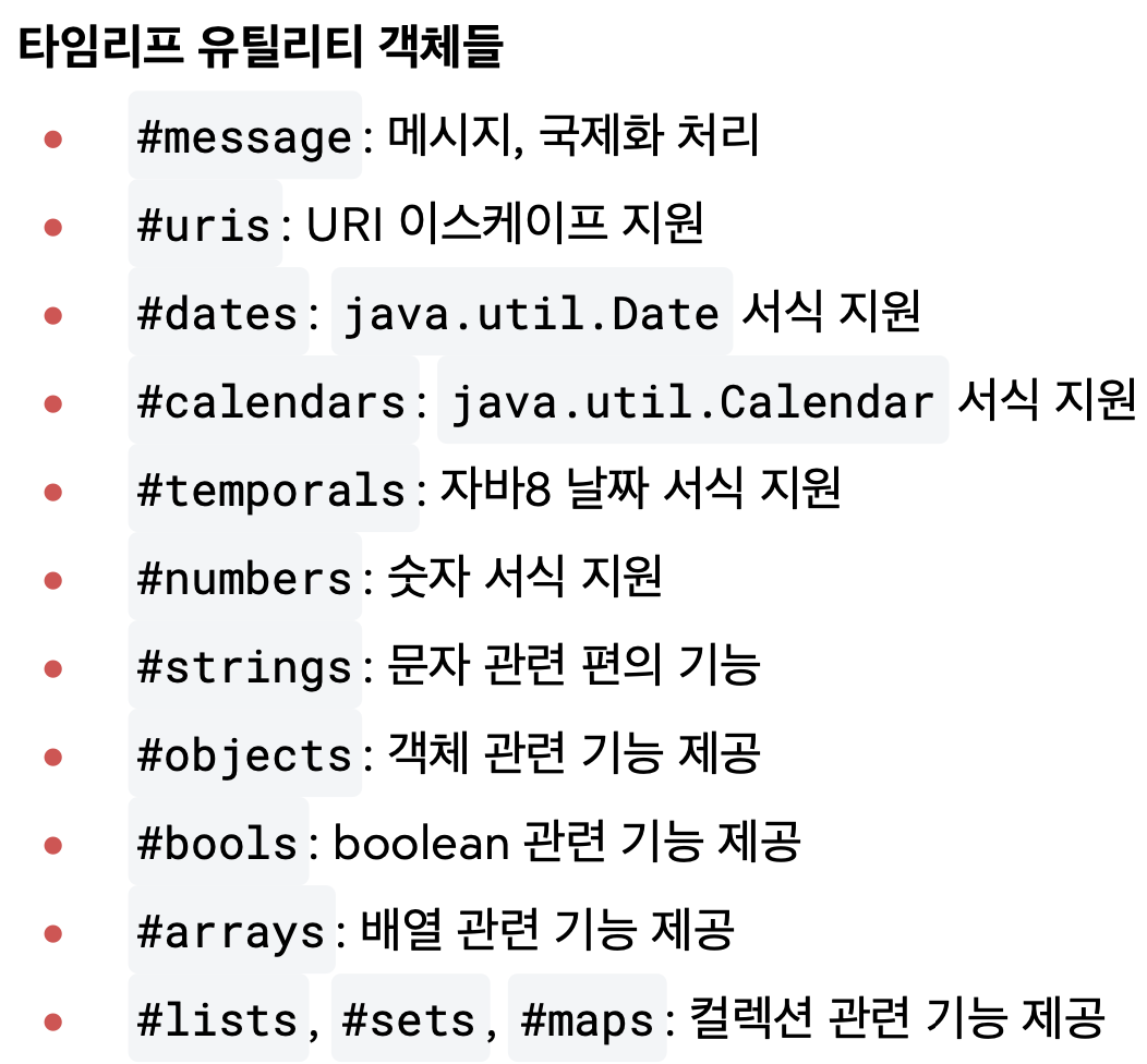 <h1>지역 변수 - (th:with)</h1> <div th:with="first=${users[0]}"> <p>처음 사람의 이름은 <span th:text="${first.username}"></span></p> </div>기본 객체들