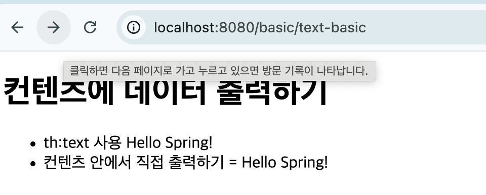 HTML의 콘텐츠(content)에 데이터를 출력할 때는 <span th:text="${data}">와 같이 th:text 를 사용하면 된다