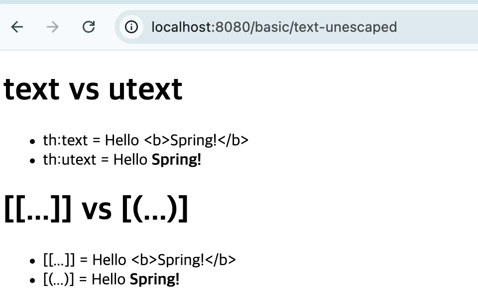 @GetMapping("text-unescaped") public String textUnescaped(Model model) { model.addAttribute("data", "Hello <b>Spring!</b>"); return "basic/text-unescaped"; }<ul> <li>th:text = <span th:text="${data}"></span></li> <li>th:utext = <span th:utext="${data}"></span></li> </ul> <h1><span th:inline="none">[[...]] vs [(...)]</span></h1> <ul> <li><span th:inline="none">[[...]] = </span>[[${data}]]</li> <li><span th:inline="none">[(...)] = </span>[(${data})]</li> </ul>