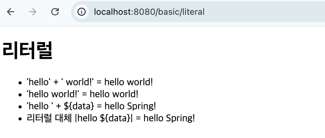 @GetMapping("/literal") public String literal(Model model) { model.addAttribute("data", "Spring!"); return "basic/literal"; }<li>'hello' + ' world!' = <span th:text="'hello' + ' world!'"></span></li> <li>'hello world!' = <span th:text="'hello world!'"></span></li> <li>'hello ' + ${data} = <span th:text="'hello ' + ${data}"></span></li> <li>리터럴 대체 |hello ${data}| = <span th:text="|hello ${data}|"></span></li>