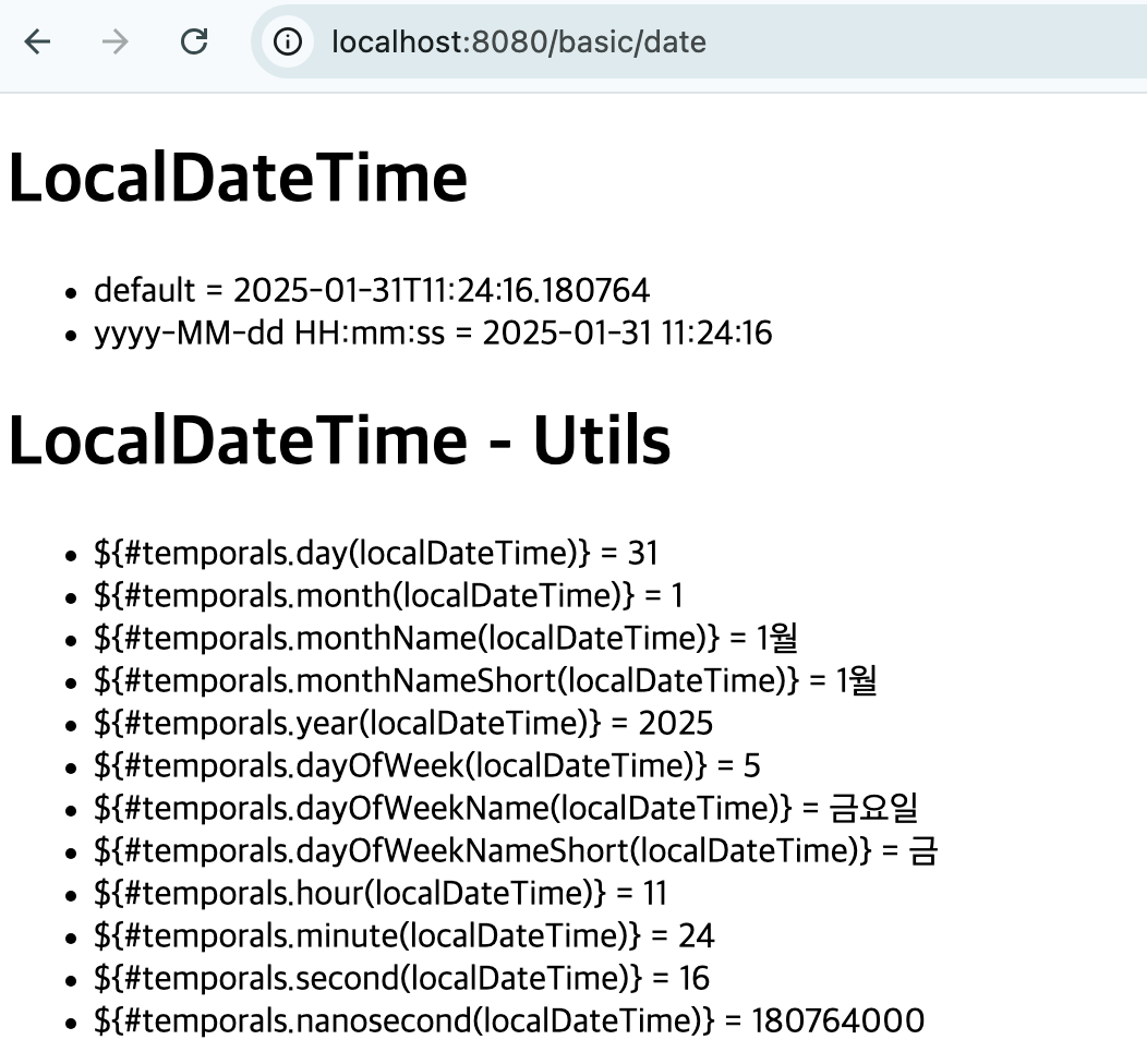 @GetMapping("/basic-objects") public String basicObjects(Model model, HttpServletRequest request, HttpServletResponse response, HttpSession session) { session.setAttribute("sessionData", "Hello Session"); model.addAttribute("request", request); model.addAttribute("response", response); model.addAttribute("servletContext", request.getServletContext()); return "basic/basic-objects"; } @Component("helloBean") static class HelloBean { public String hello(String data) { return "Hello " + data; } }유틸리티 객체와 날짜