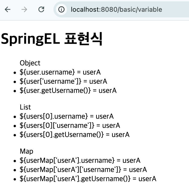 @GetMapping("/variable") public String variable(Model model) { User userA = new User("userA", 10); User userB = new User("userB", 20); List<User> list = new ArrayList<>(); list.add(userA); list.add(userB); Map<String, User> map = new HashMap<>(); map.put("userA", userA); map.put("userB", userB); model.addAttribute("user", userA); model.addAttribute("users", list); model.addAttribute("userMap", map); return "basic/variable"; } @Data static class User { private String username; private int age; public User(String username, int age) { this.username = username; this.age = age; } }