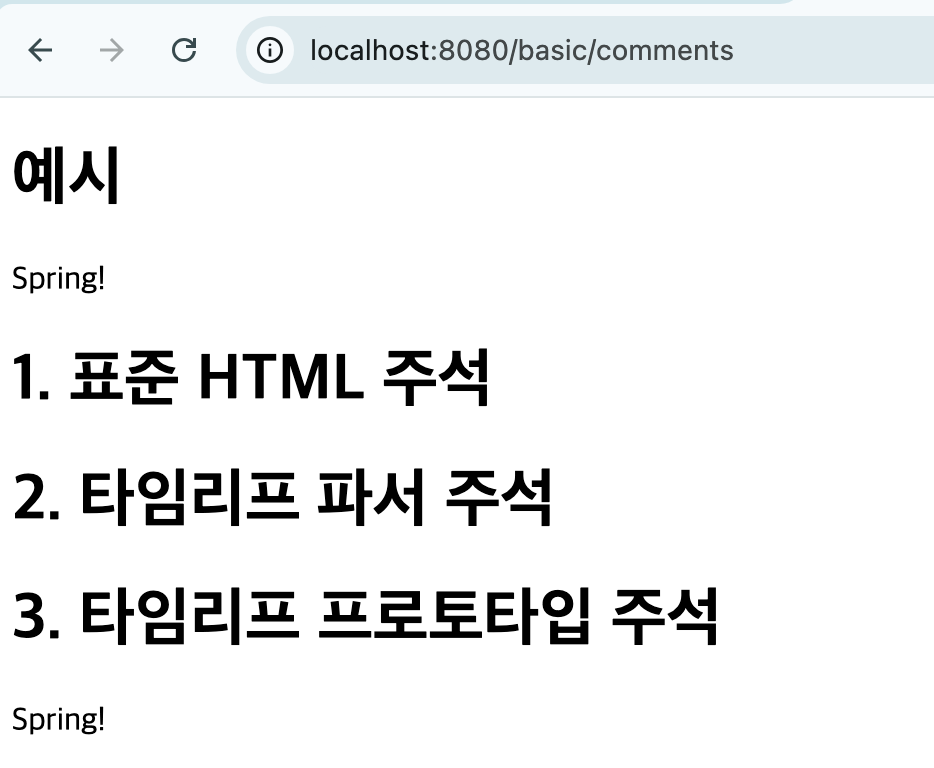 <body> <h1>예시</h1> <span th:text="${data}">html data</span> <h1>1. 표준 HTML 주석</h1> <!-- <span th:text="${data}">html data</span> --> <h1>2. 타임리프 파서 주석</h1> <!--/* [[${data}]] */--> <!--/*--> <span th:text="${data}">html data</span> <!--*/--> <h1>3. 타임리프 프로토타입 주석</h1> <!--/*/ /*/--> <span th:text="${data}">html data</span> </body> // 결과 <h1>예시</h1> <span>Spring!</span> <h1>1. 표준 HTML 주석</h1> <!-- <span th:text="${data}">html data</span> --> <h1>2. 타임리프 파서 주석</h1> <h1>3. 타임리프 프로토타입 주석</h1> <span>Spring!</span>