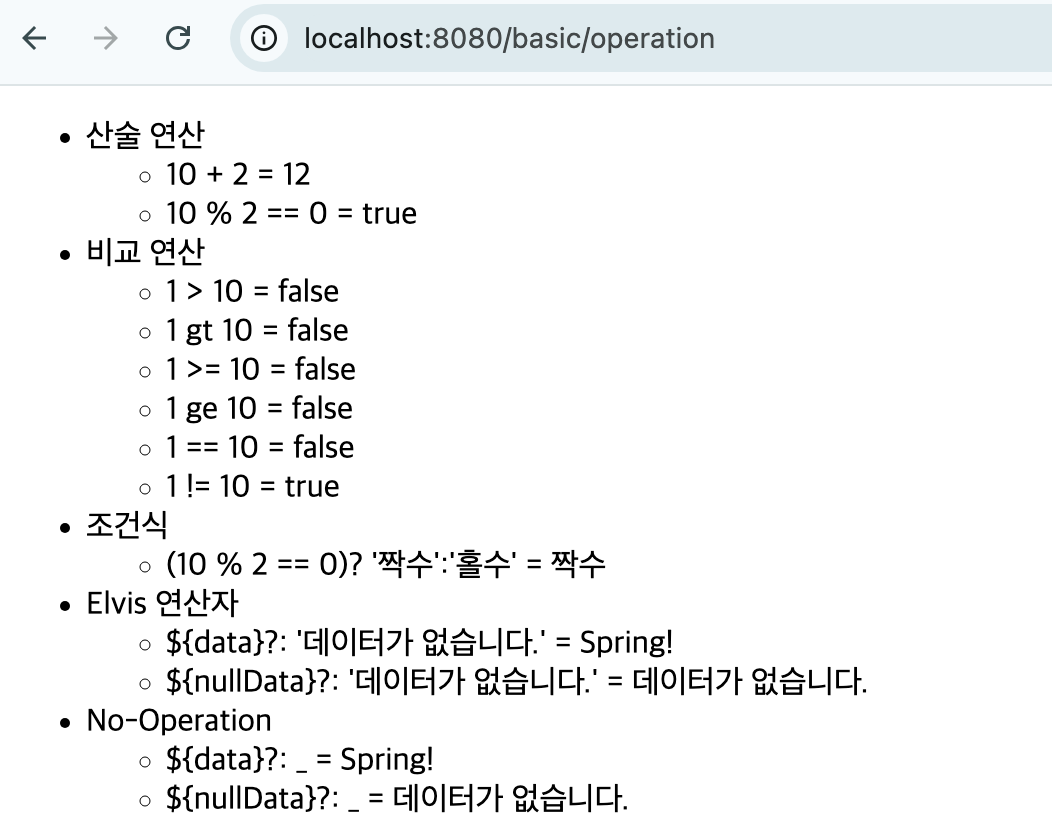 @GetMapping("/operation") public String operation(Model model) { model.addAttribute("nullData", null); model.addAttribute("data", "Spring!"); return "basic/operation"; }<!DOCTYPE html> <html xmlns:th="http://www.thymeleaf.org"> <head> <meta charset="UTF-8"> <title>Title</title> </head> <body> <ul> <li>산술 연산 <ul> <li>10 + 2 = <span th:text="10 + 2"></span></li> <li>10 % 2 == 0 = <span th:text="10 % 2 == 0"></span></li> </ul> </li> <li>비교 연산 <ul> <li>1 > 10 = <span th:text="1 > 10"></span></li> <li>1 gt 10 = <span th:text="1 gt 10"></span></li> <li>1 >= 10 = <span th:text="1 >= 10"></span></li> <li>1 ge 10 = <span th:text="1 ge 10"></span></li> <li>1 == 10 = <span th:text="1 == 10"></span></li> <li>1 != 10 = <span th:text="1 != 10"></span></li> </ul> </li> <li>조건식 <ul> <li>(10 % 2 == 0)? '짝수':'홀수' = <span th:text="(10 % 2 == 0)? '짝수':'홀수'"></span></li> </ul> </li> <li>Elvis 연산자 <ul> <li>${data}?: '데이터가 없습니다.' = <span th:text="${data}?: '데이터가 없습니다.'"></span></li> <li>${nullData}?: '데이터가 없습니다.' = <span th:text="${nullData}?: '데이터가 없습니다.'"></span></li> </ul> </li> <li>No-Operation <ul> <li>${data}?: _ = <span th:text="${data}?: _">데이터가 없습니다.</span></li> <li>${nullData}?: _ = <span th:text="${nullData}?: _">데이터가 없습니다.</span></li> </ul> </li> </ul> </body> </html>