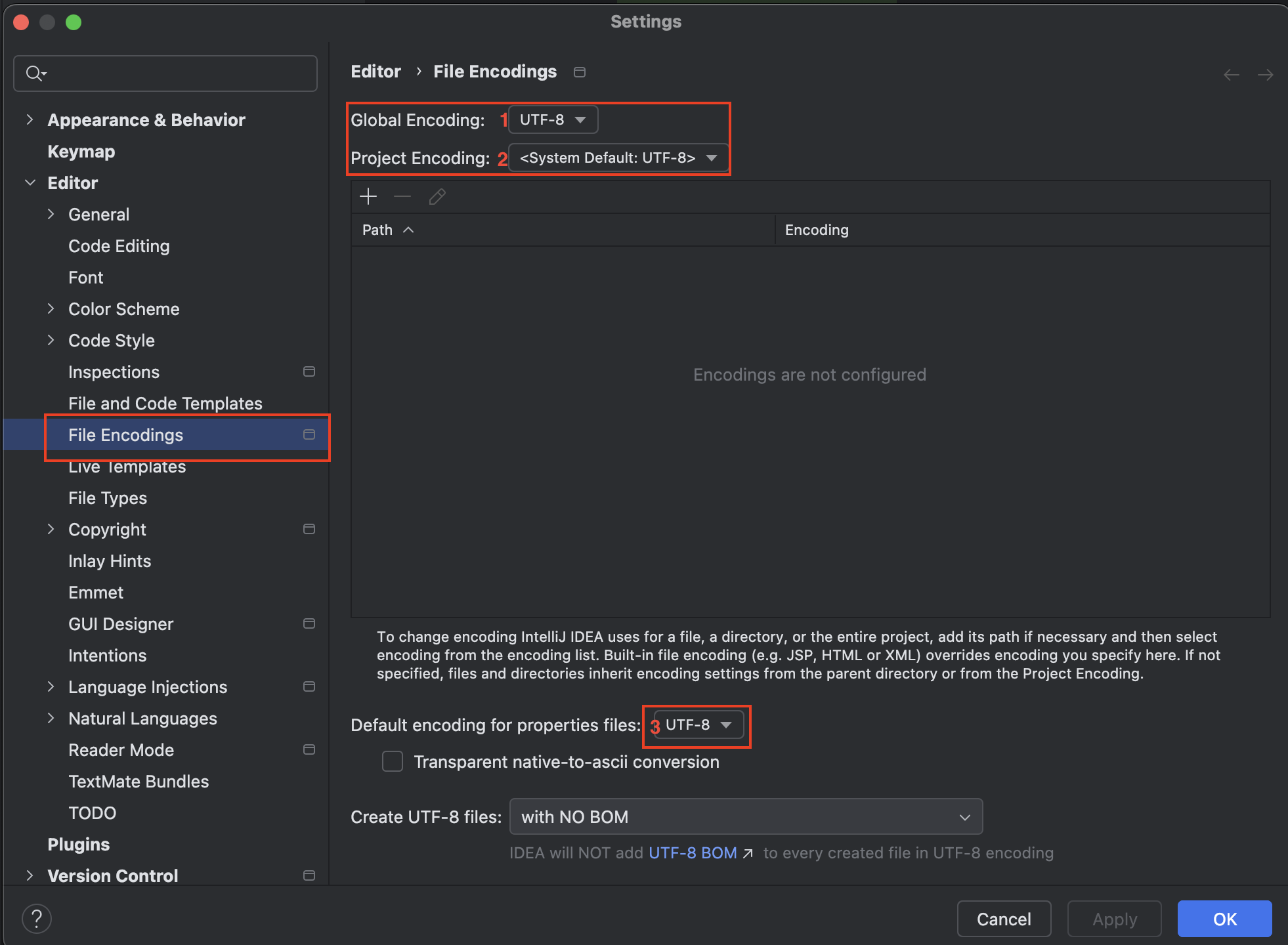 settings > file encodings 에 들어간 후 3가지 encoding을 utf-8로 변경한다