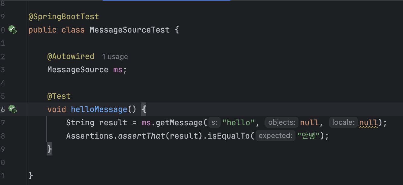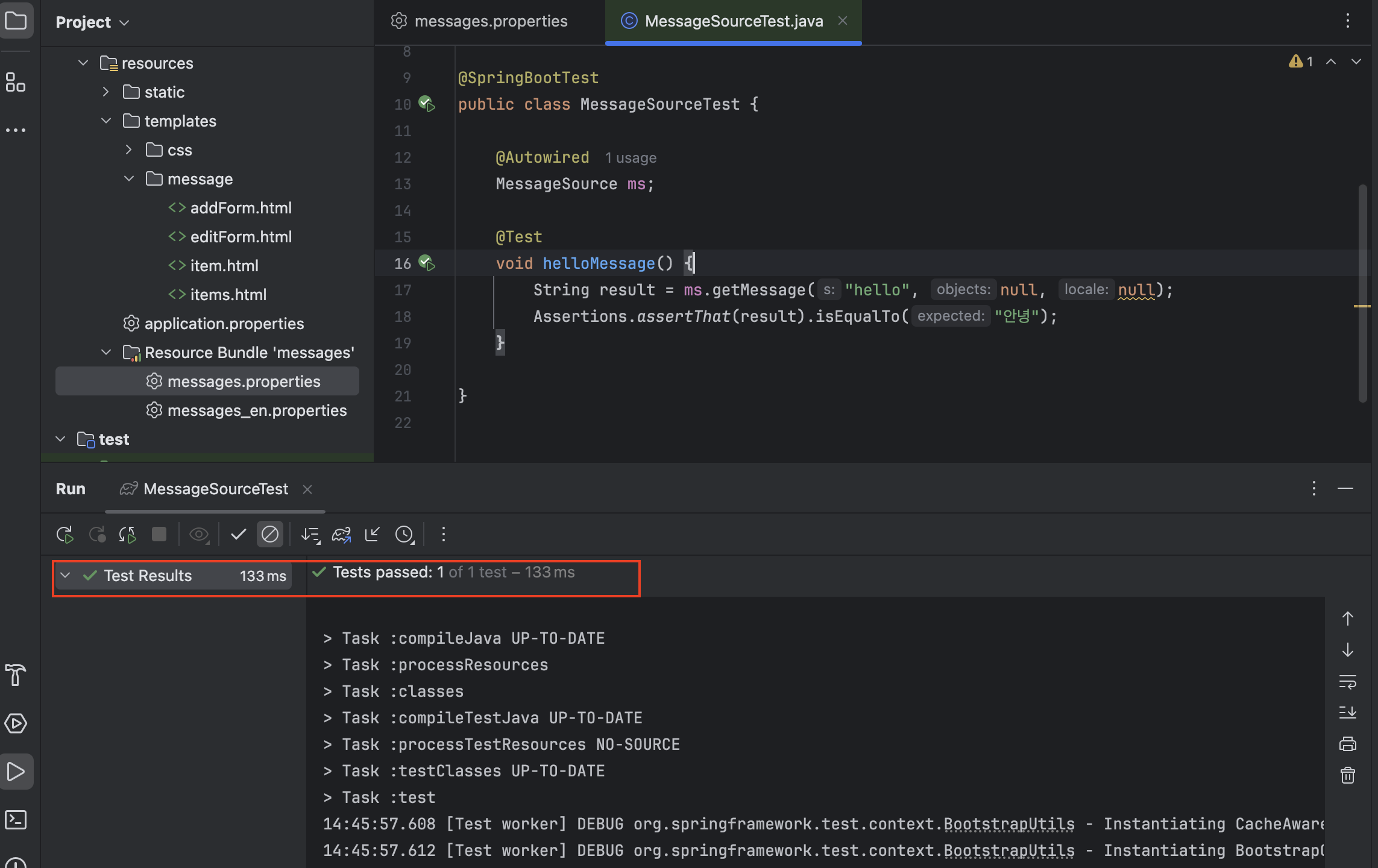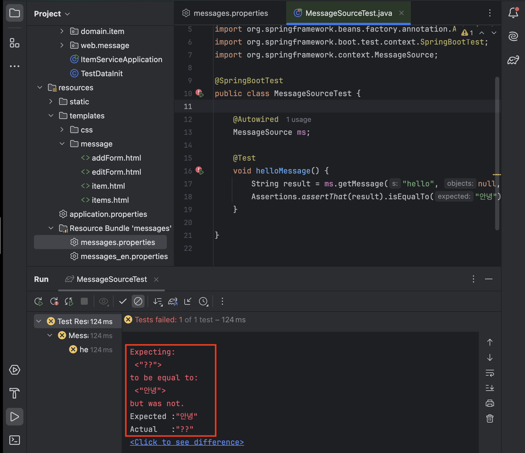 메시지 국제화 테스트 도중 테스트가 계속 실패했다