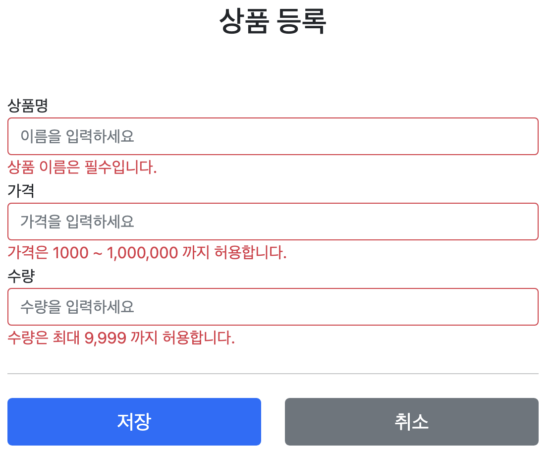 고객이 상품 등록 폼에서 상품명을 입력하지 않거나, 가격, 수량 등이 너무 작거나 커서 검증 범위를 넘어서면, 서버 검