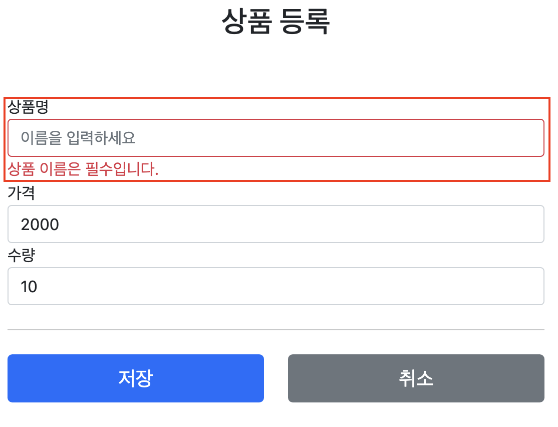 <div> <label for="itemName" th:text="#{label.item.itemName}">상품명</label> <input type="text" id="itemName" th:field="*{itemName}" th:class="${errors?.containsKey('itemName')} ? 'form-control field-error' : 'form-control'" class="form-control" placeholder="이름을 입력하세요"> <div class="field-error" th:if="${errors?.containsKey('itemName')}" th:text="${errors['itemName']}"> 상품명 오류 </div> </div>