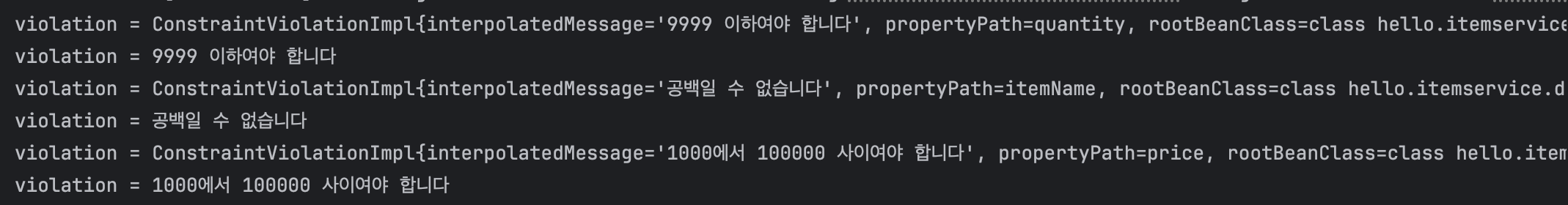 public class BeanValidationTest { @Test void beanValidation() { ValidatorFactory factory = Validation.buildDefaultValidatorFactory(); Validator validator = factory.getValidator(); Item item = new Item(); item.setItemName(" "); //공백 item.setPrice(0); item.setQuantity(10000); Set<ConstraintViolation<Item>> violations = validator.validate(item); for (ConstraintViolation<Item> violation : violations) { System.out.println("violation=" + violation); System.out.println("violation.message=" + violation.getMessage()); } } }