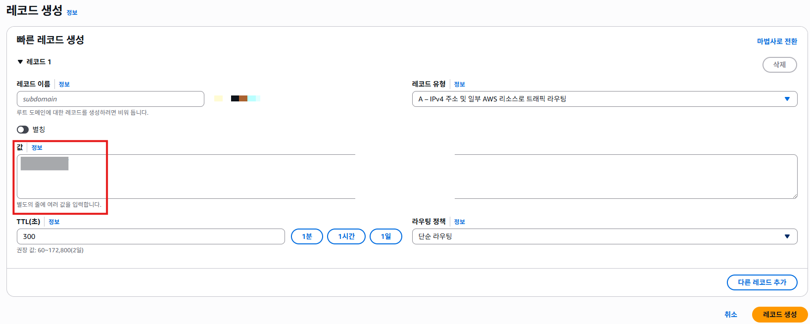- cf) 레코드 이름의 경우 내가 구매한 도메인 앞부분 설정이 가능하다 (ex. www.)