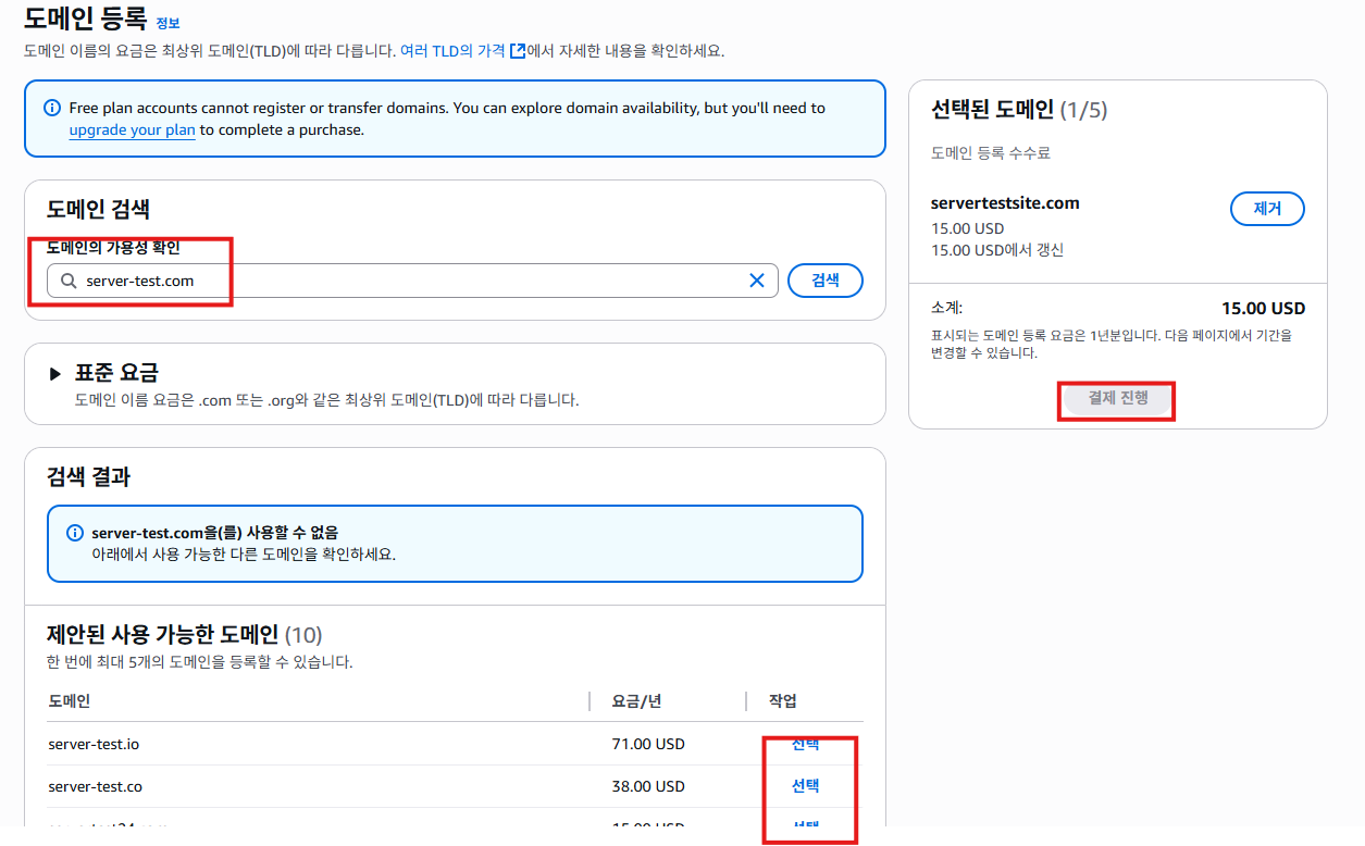 - Route53 이용해서 바로 도메인 등록을 하려 했더니 free plan은 안 되는 것 같다 마지막 '결제진행' 버튼이 비활성화