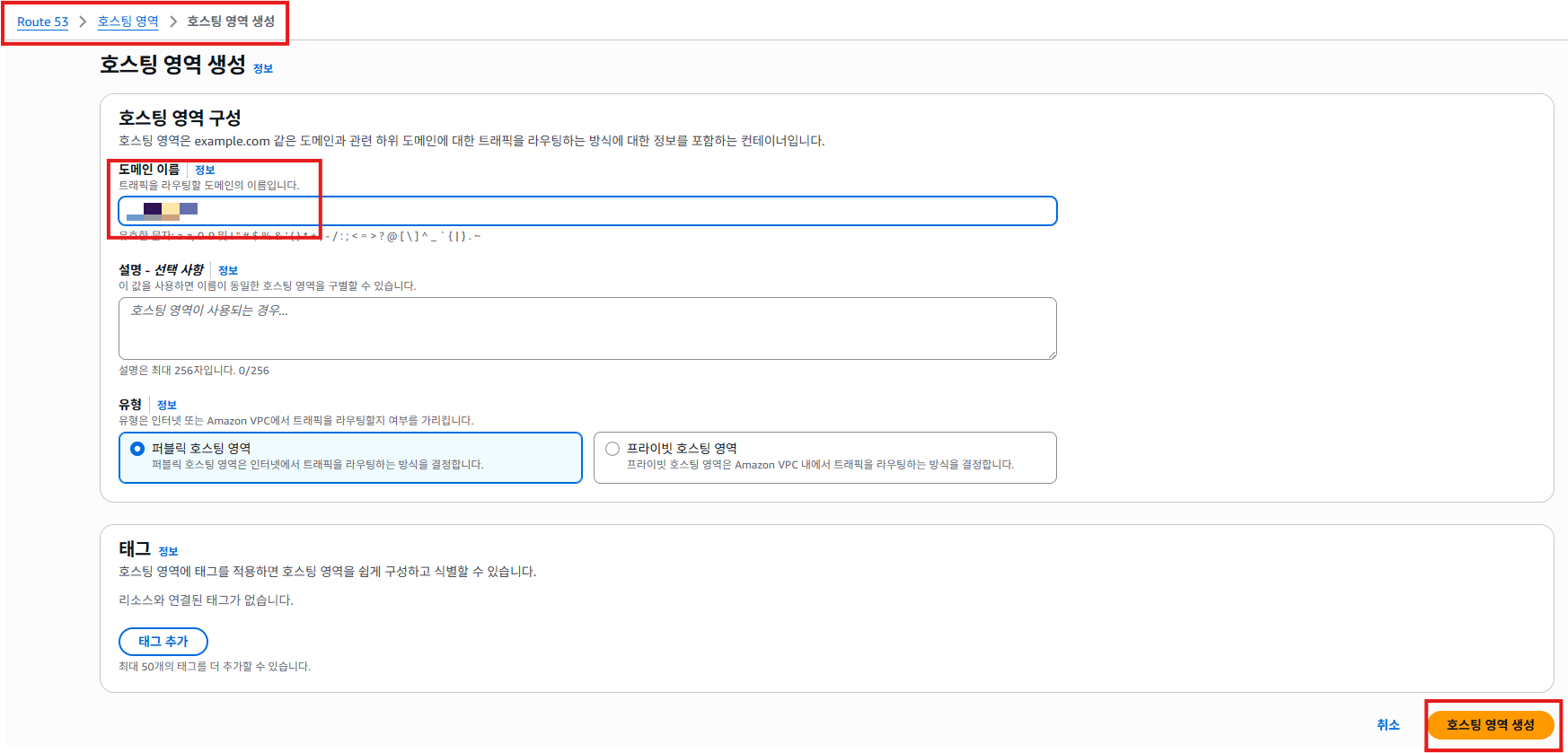 - Route53 > 호스팅영역 > 호스팅영역생성 > 가비아에서 구매한 도메인 이름을 입력해 준다