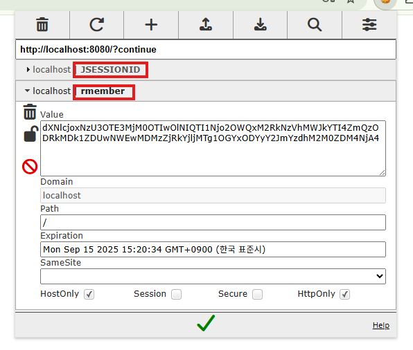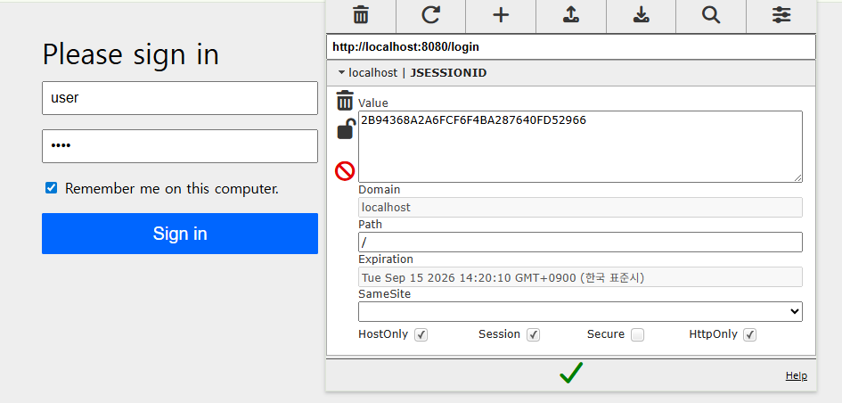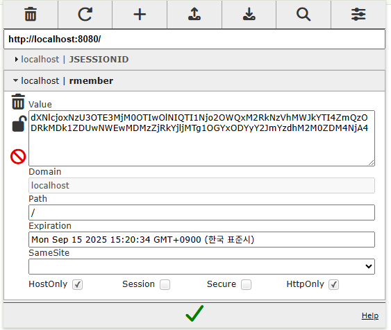 - 세션ID 삭제 후 다시 URL로 접속하면 기억된 쿠키로 인해 자동로그인 됨을 확인할 수 있다