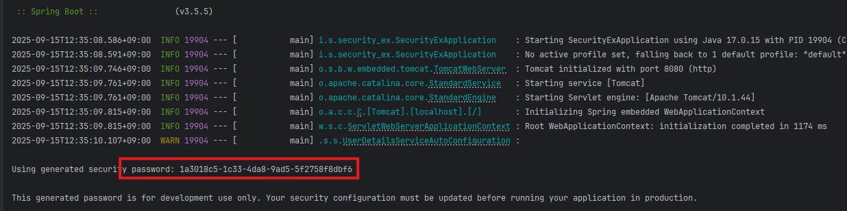 설정 후 run 하면 랜덤 비밀번호를 콘솔에서 확인할 수 있고 Spring Security 기본 로그인 페이지에서 로그인을 확인할 수 있다
