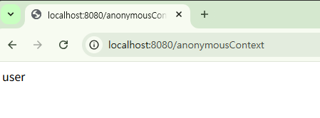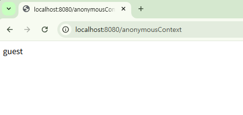 @RestController public class IndexController { ... @GetMapping("/anonymous") public String anonymous() { return "anonymous"; } @GetMapping("/authentication") public String authentication(Authentication authentication) { if (authentication instanceof AnonymousAuthenticationToken) { return "anonymous"; } else { return "not anonymous"; } } @GetMapping("/anonymousContext") public String anonymousContext(@CurrentSecurityContext SecurityContext context) { return context.getAuthentication().getName(); } }@EnableWebSecurity @Configuration public class SecurityConfig { @Bean public SecurityFilterChain securityFilterChain(HttpSecurity http) throws Exception { http.authorizeHttpRequests(auth -> auth .requestMatchers("/anonymous").hasRole("GUEST") .requestMatchers("/anonymousContext", "/authentication").permitAll() .anyRequest().authenticated()) .formLogin(Customizer.withDefaults()) .anonymous(annoymous -> annoymous .principal("guest") .authorities("ROLE_GUEST") ); return http.build(); } @Bean public UserDetailsService userDetailsService() { UserDetails user = User.withUsername("user") .password("{noop}1111") .roles("USER").build(); return new InMemoryUserDetailsManager(user); } }- AnonymousAuthenticationFilter