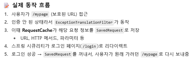 - 리다이렉트 된 후에 이전에 했던 요청 정보를 담고 있는 'SavedRequest’ 객체를 쿠키 혹은 세션에 저장하고 필요시 다시 가져와 실행하는 캐시 메커니즘