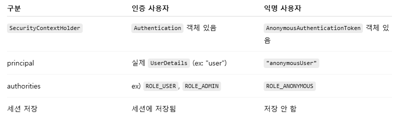 - 인증되지 않은 사용자를 null로 두는 대신, ROLE_ANONYMOUS 인증 객체로 취급