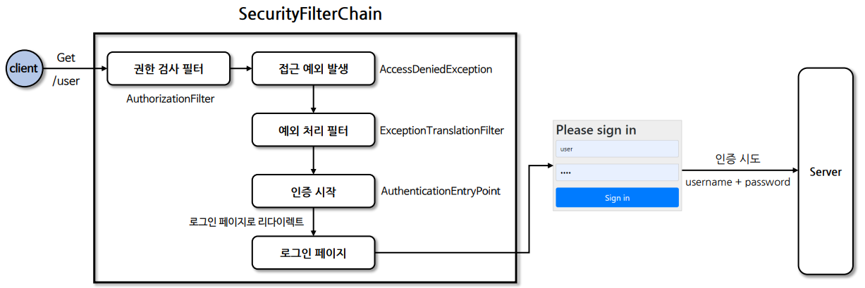 - ExceptionTranslationFilter가 인증/인가 예외 처리 하는데 로그인이 안 된 경우 AuthenticationEntryPoint 호출