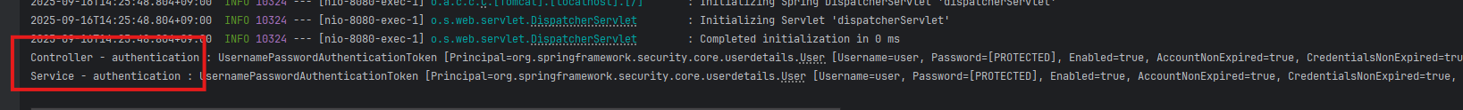 @RestController public class IndexController { @Autowired SecurityContextService securityContextService; @GetMapping("/") public String index() { SecurityContext securityContext = SecurityContextHolder.getContextHolderStrategy().getContext(); Authentication authentication = securityContext.getAuthentication(); System.out.println("Controller - authentication : " + authentication); securityContextService.securityContext(); return "index"; } ... }@Service public class SecurityContextService { public void securityContext() { // 파라미터 전달 없이 사용, 전역적으로 사용할 수 있음 SecurityContext securityContext = SecurityContextHolder.getContextHolderStrategy().getContext(); Authentication authentication = securityContext.getAuthentication(); System.out.println("Service - authentication : " + authentication); } }