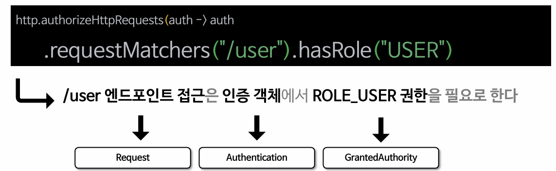 - Aythentication에 GrantedAuthority 권한 목록을 저장하며 이를 통해 인증 주체에게 부여된 권한을 사용