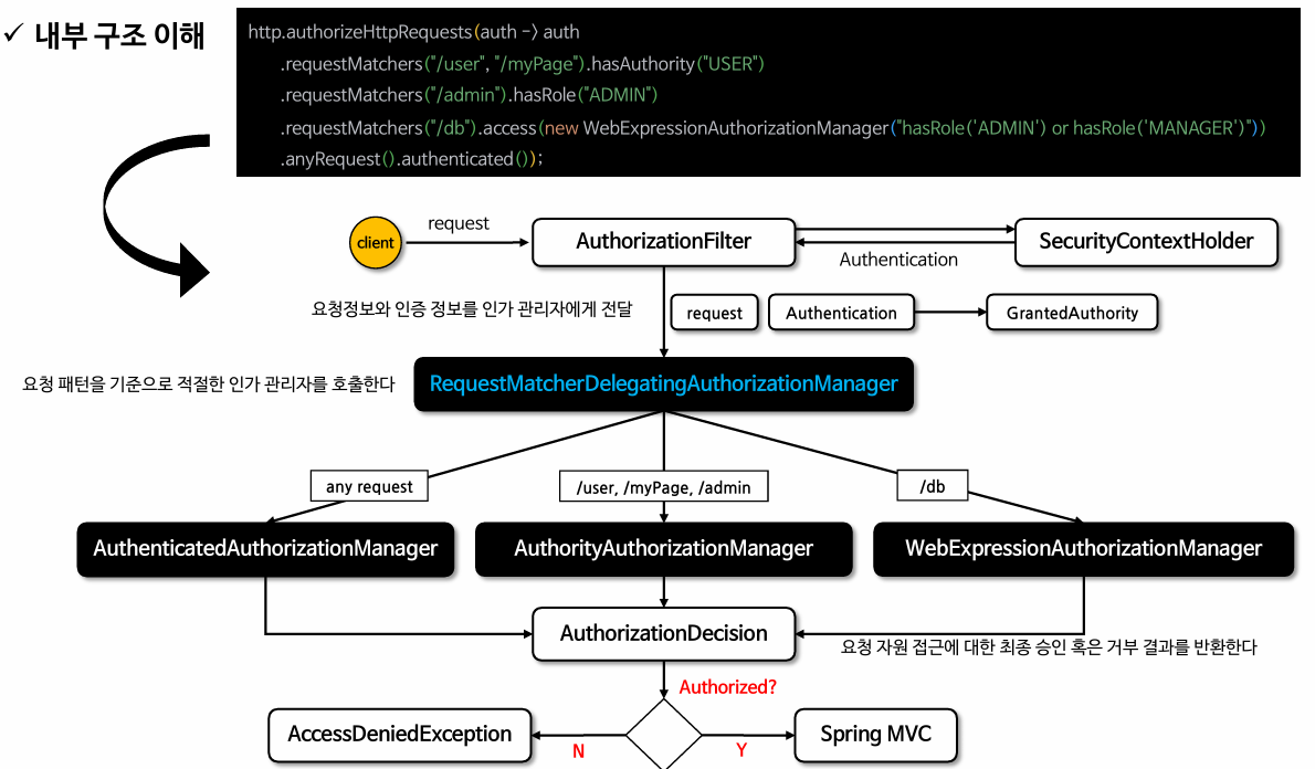- AuthorizationManager는 Spring Security의 필수 구성요소로서 권한 부여 처리는 AuthorizationFilter를 통해 이루어진다