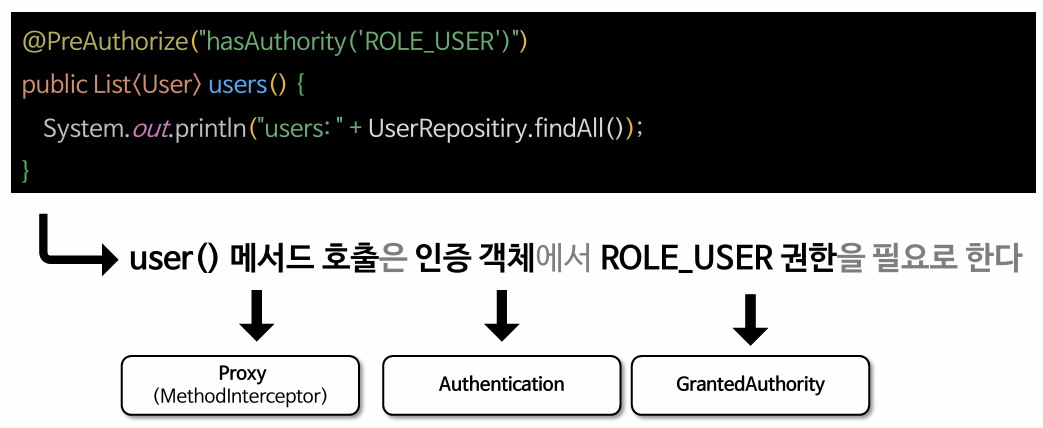 - 메서드 기반 권한 부여는 내부적으로 AOP 방식에 의해 초기화 설정이 이루어지며 메서드의 호출을 MethodInterceptor가 가로채어 처리