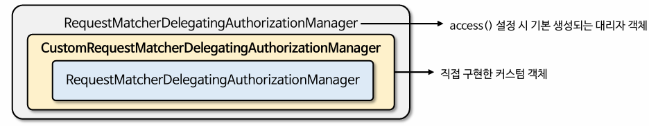 - access()에 지정한 AuthorizationManager 객체는 RequestMatcherDelegatingAuthorizationManager의 매핑 속성에 저장