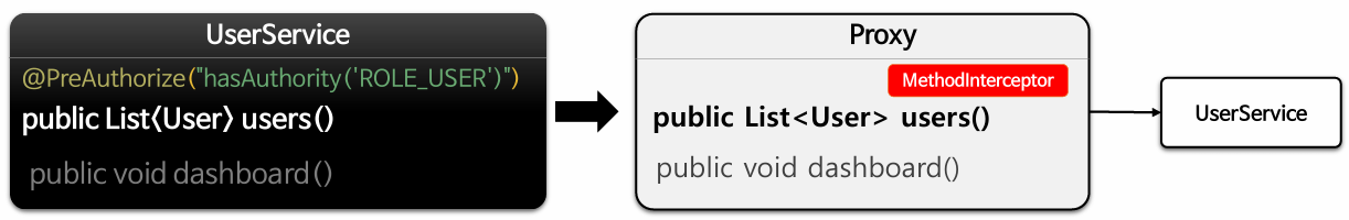 - 보안이 설정된 메서드에는 인가처리 기능을 하는 Advice(MethodInterceptor)를 등록한다