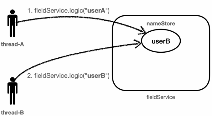 @Slf4j public class FieldService { private String nameStore; public String logic(String name) { log.info("저장 name={} -> nameStore={}", name, nameStore); nameStore = name; sleep(1000); log.info("조회 nameStore={}", nameStore); return nameStore; } private void sleep(int millis) { try { Thread.sleep(millis); } catch (InterruptedException e) { e.printStackTrace(); } } }@Slf4j public class FieldServiceTest { private FieldService fieldService = new FieldService(); @Test void field() { log.info("main start"); Runnable userA = () -> { fieldService.logic("userA"); }; Runnable userB = () -> { fieldService.logic("userB"); }; Thread threadA = new Thread(userA); threadA.setName("thread-A"); Thread threadB = new Thread(userB); threadB.setName("thread-B"); threadA.start(); sleep(2000); // 동시성 문제 발생 x threadB.start(); sleep(3000); // 메인 thread 종료 대기 log.info("main exit"); } private void sleep(int millis) { try { Thread.sleep(millis); } catch (InterruptedException e) { e.printStackTrace(); } } }