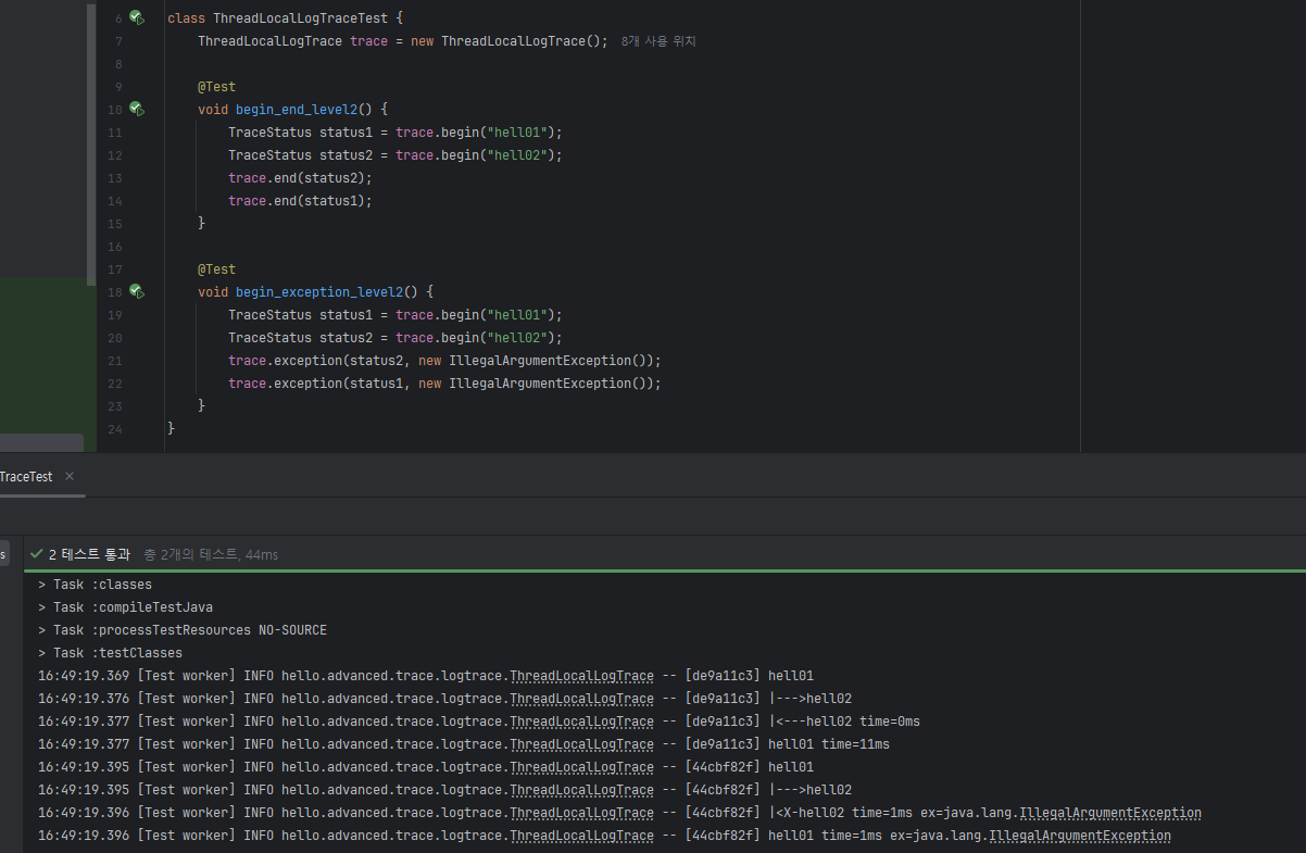 @Slf4j public class ThreadLocalLogTrace implements LogTrace { private static final String START_PREFIX = "--->"; private static final String COMPLETE_PREFIX = "<---"; private static final String EX_PREFIX = "<X-"; // traceId 동기화 > 동기화 이슈 발생 // private TraceId traceIdHolder; private ThreadLocal<TraceId> traceIdHolder = new ThreadLocal<>(); @Override public TraceStatus begin(String message) { syncTraceId(); TraceId traceId = traceIdHolder.get(); Long startTimeMs = System.currentTimeMillis(); log.info("[{}] {}{}", traceId.getId(), addSpace(START_PREFIX, traceId.getLevel()), message); return new TraceStatus(traceId, startTimeMs, message); } private void syncTraceId() { TraceId traceId = traceIdHolder.get(); if (traceId == null) { traceIdHolder.set(new TraceId()); } else { traceIdHolder.set(traceId.createNextId()); } } @Override public void end(TraceStatus status) { complete(status, null); } @Override public void exception(TraceStatus status, Exception e) { complete(status, e); } private void complete(TraceStatus status, Exception e) { Long stopTimeMs = System.currentTimeMillis(); long resultTimeMs = stopTimeMs - status.getStartTimeMs(); TraceId traceId = status.getTraceId(); if (e == null) { log.info("[{}] {}{} time={}ms", traceId.getId(), addSpace(COMPLETE_PREFIX, traceId.getLevel()), status.getMessage(), resultTimeMs); } else { log.info("[{}] {}{} time={}ms ex={}", traceId.getId(), addSpace(EX_PREFIX, traceId.getLevel()), status.getMessage(), resultTimeMs, e.toString()); } releaseTraceId(); } private void releaseTraceId() { TraceId traceId = traceIdHolder.get(); if (traceId.isFirstLevel()) { traceIdHolder.remove(); // destroy } else { traceIdHolder.set(traceId.createPreviousId()); } } private static String addSpace(String prefix, int level) { StringBuilder sb = new StringBuilder(); for (int i = 0; i < level; i++) { sb.append((i==level-1) ? "|" + prefix : "| "); } return sb.toString(); } }- 변경 전 : private TraceId traceIdHolder;