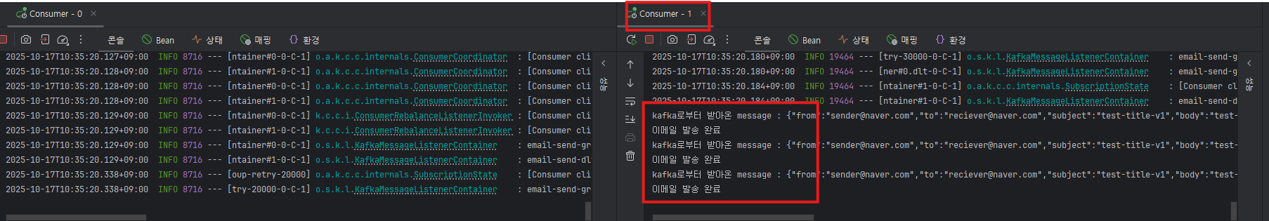 - 2개의 컨슈머 서버가 토픽의 메시지를 병렬적으로 처리