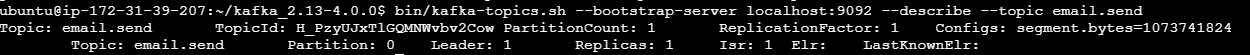 # 토픽 세부 정보 조회 $ bin/kafka-topics.sh --bootstrap-server localhost:9092 --describe --topic email.send