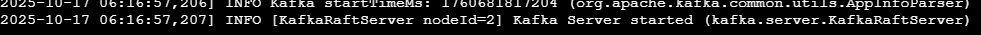 # kafka 디렉터리로 이동 cd .. # kafka 종료 $ bin/kafka-server-stop.sh# 처음 실행하는 kafka 노드 실행 $ KAFKA_CLUSTER_ID="$(bin/kafka-storage.sh random-uuid)" $ KAFKA_CONTROLLER_ID="$(bin/kafka-storage.sh random-uuid)" $ bin/kafka-storage.sh format -t $KAFKA_CLUSTER_ID -c config/server.properties --initial-controllers "1@localhost:9093:$KAFKA_CONTROLLER_ID" $ bin/kafka-storage.sh format -t $KAFKA_CLUSTER_ID -c config/server2.properties --no-initial-controllers $ bin/kafka-storage.sh format -t $KAFKA_CLUSTER_ID -c config/server3.properties --no-initial-controllers # kafka 노드 3대 모두 실행 (각 창 띄워서 진행) $ bin/kafka-server-start.sh config/server.properties $ bin/kafka-server-start.sh config/server2.properties $ bin/kafka-server-start.sh config/server3.properties