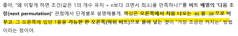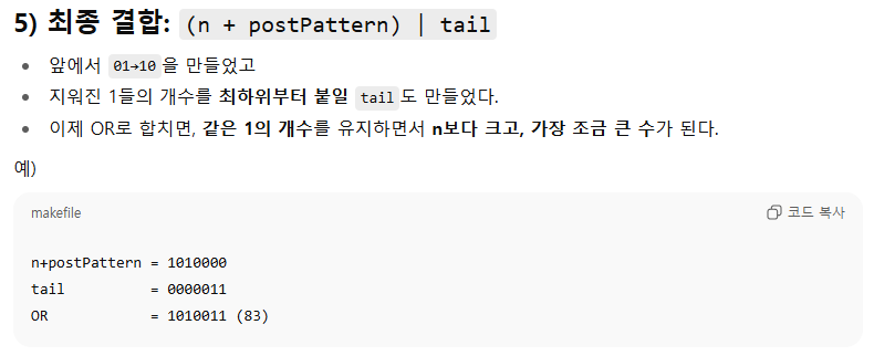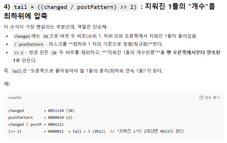 - n + postPattern : 뽑아낸 1비트 위치가 캐리를 일으켜 오른쪽 연속된 1 묶음을 깨뜨린다